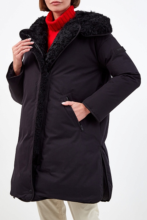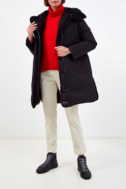 Женская парка от Yves Salomon выполнена из непромокаемой и ветрозащитной ткани в черном цвете. Утепляющая прослойка из пуха делает модель идеальной для составления зимних образов. Объемный крой не стесняет движений и сохраняет тепло. Расстегнутое изделие выглядит гармонично благодаря меховой отделке на внутренней стороне планок, воротник из густой овчины придает дополнительный комфорт. Детали: разрезы по бокам, прорезные карманы. Сделано во Франции.