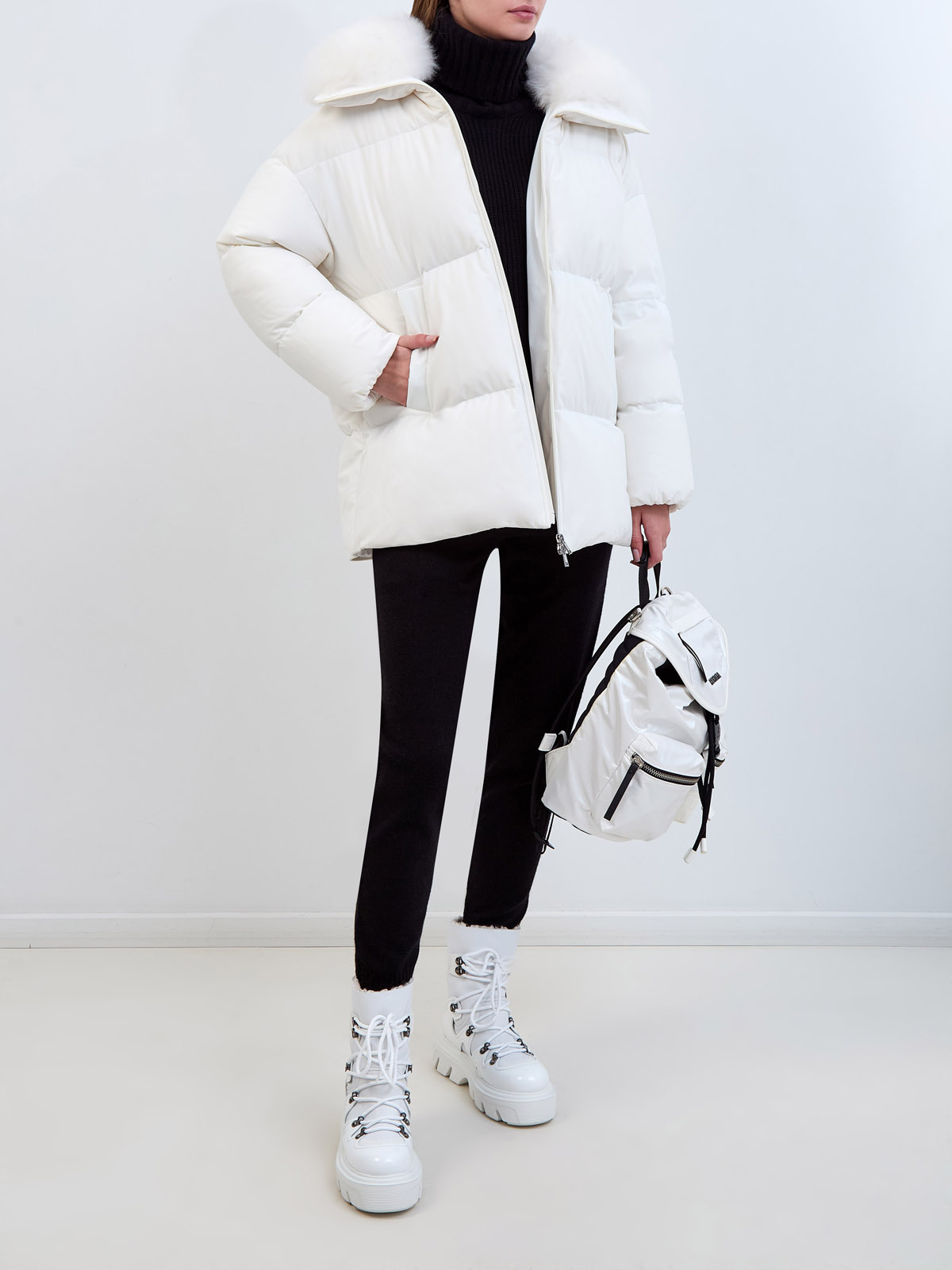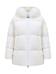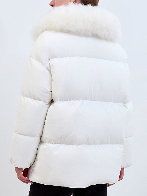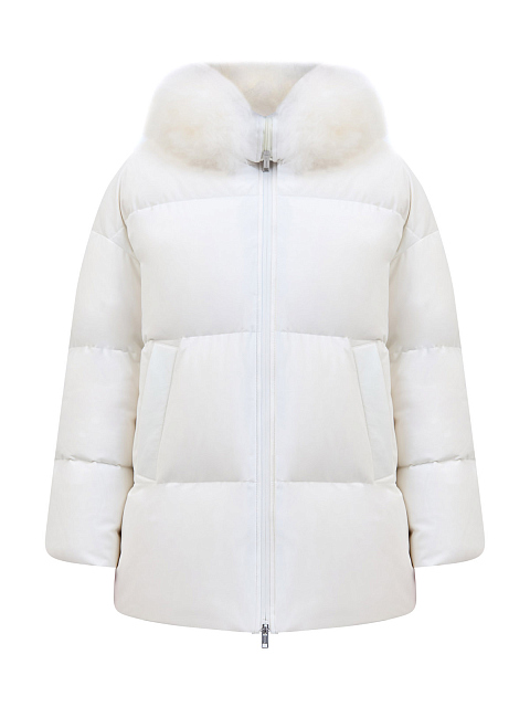 Белый пуховик от Yves Salomon выполнен из водонепроницаемого нейлона с матовым финишем. Наполнитель из пуха подчеркивает объемный крой и делает модель идеальной для составления зимних образов, а ворот с окантовкой из меха ягненка дополнительно защищает лицо от ветра. Детали: прорезные карманы, застежка на молнию.