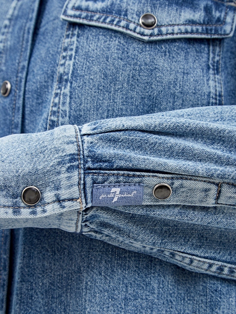 Джинсовая рубашка Emilia от 7 For All Mankind выполнена из тонкого денима в синем цвете. Хлопковый материал с выбеленным эффектом делаве станет идеальным дополнением для расслабленных образов. Контрастная прострочка швов и эмалевая фурнитура придает изделию неформальный штрих. Детали: накладные карманы, отложной ворот.