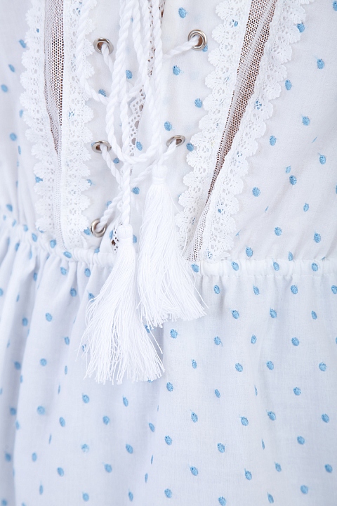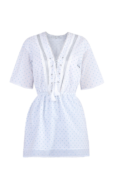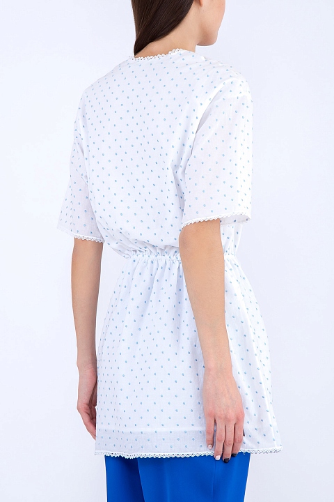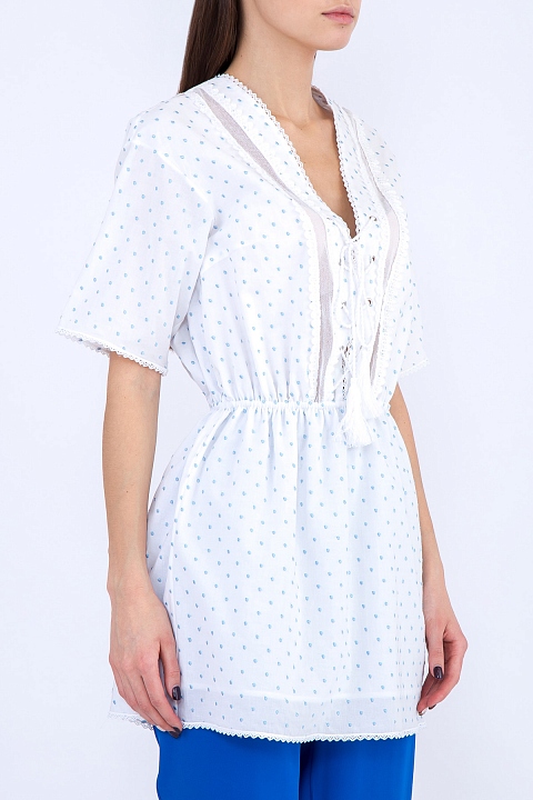 Легкая удлиненная рубашка Alexander Terekhov, выполненная из дышащего хлопка белого цвета с ненавязчивым повторяющимся узором. Кромки изделия с короткими рукавами и эластичной кулисокй на талии отделаны кружевной каймой. Глубокий V-образный вырез дополнен шнуровкой с кисточками на концах. Сделано в России.