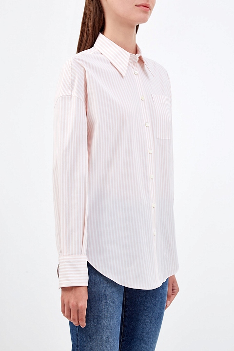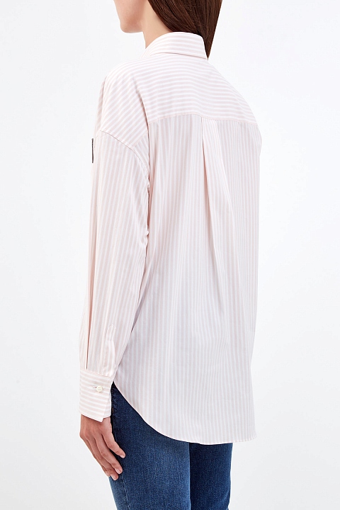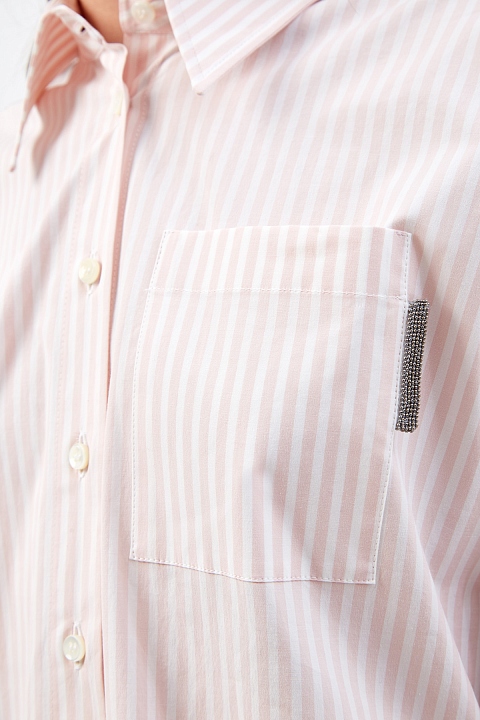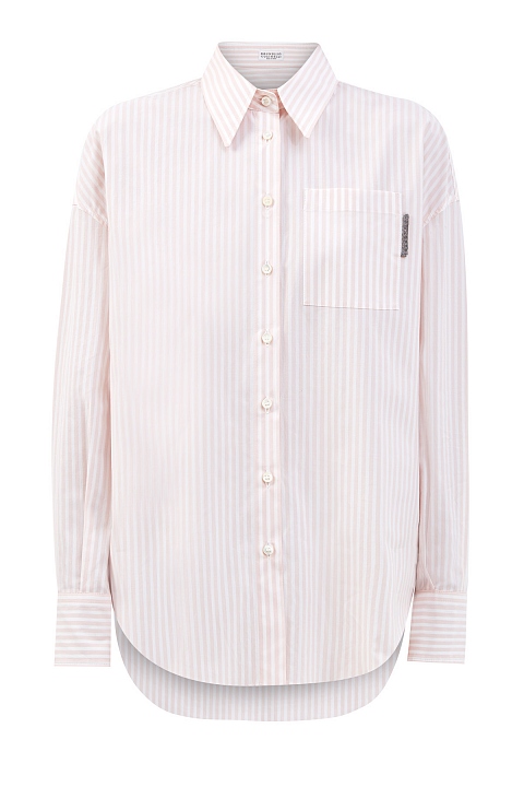 Базовая рубашка-oversize от Brunello Cucinelli выполнена из легкого хлопка. Принт в полоску и объемный крой придает изделию черты неформального шика, а вышивка Мониль на нагрудном кармане вносит в образ фирменный сверкающий акцент. Детали: асимметричный нижний край, длинные рукава с заложенными складками, застежка на пуговицы из перламутра. Сделано в Италии.