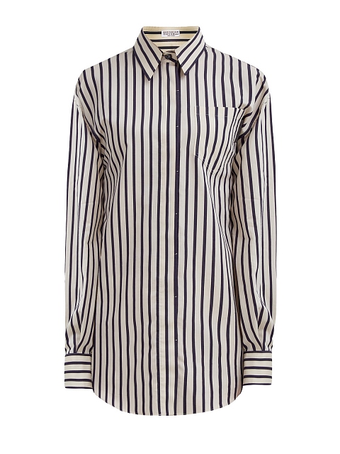 Элегантная удлиненная рубашка от Brunello Cucinelli выполнена из тонкого хлопкового твила с добавлением шелковой нити, которая придает поверхности благородный сатиновый блеск. Особенностью модели стал принт в тонкую полоску и деталь Мониль на накладном кармане. Свободный силуэт дополнен классическим отложным воротником. Детали: застежка на пуговицы из перламутра, асимметричный нижний край. Сделано в Италии.