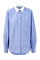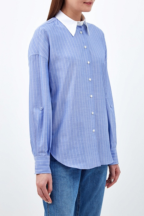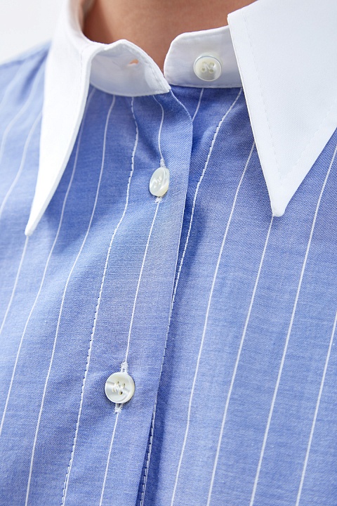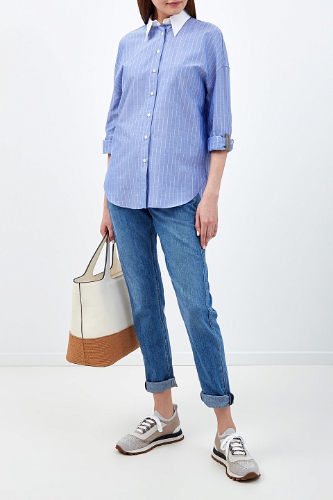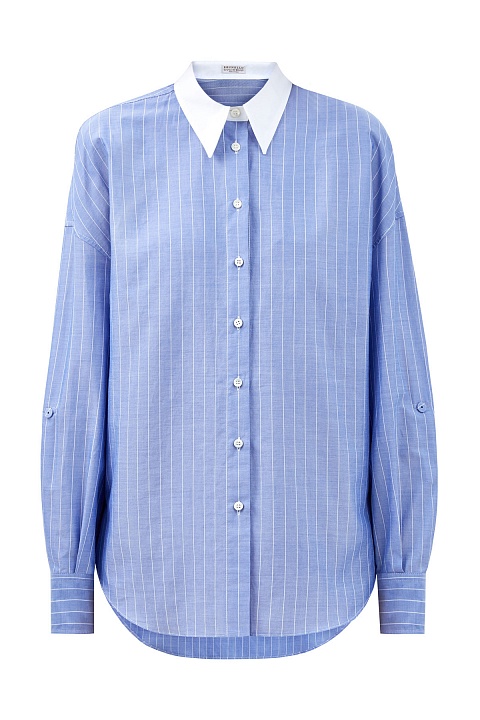 Рубашка-oversize от Brunello Cucinelli выполнена из легкого хлопка — держащий форму материал подчеркивает четкие линии кроя и идеально подходит для летнего сезона. Принт в тонкую мелованную полоску дополнен контрастным воротником. Рукава с лентами-фиксаторами с вышивкой Мониль делают дизайн еще более практичным. Детали: асимметричный нижний край, застежка на пуговицы из перламутра. Сделано в Италии.