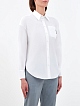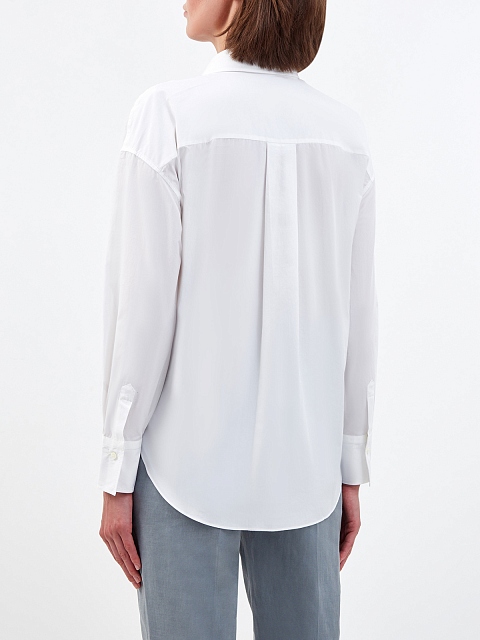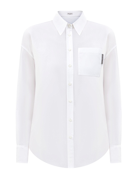 Лаконичная рубашка из гладкого хлопкового поплина от Brunello Cucinelli выполнена в универсальном белом цвете. Стиль smart casual подчеркивает расклешенный силуэт с асимметричным нижним краем, а застежка на планку с пуговицами и отложной воротник визуально структурируют образ. Передний накладной карман дополнен мерцающей вставкой с вышивкой ювелирными бусинами Мониль. Сделано в Италии.