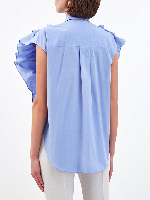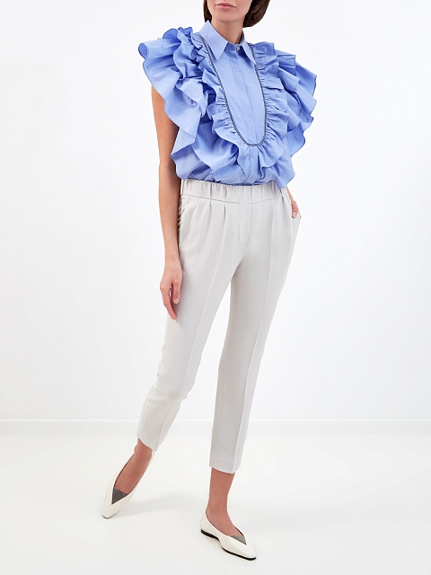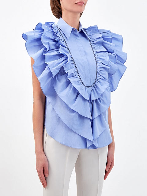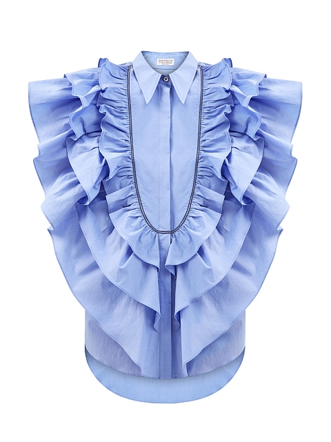 Женственная рубашка без рукавов от Brunello Cucinelli выполнена в небесно-голубом оттенке. Объемные многослойные оборки придают изделию черты неформального шика, а вышивка цепочкой Мониль вносит в образ фирменный сверкающий акцент. Легкая текстура хлопкового поплина обеспечивает максимальный комфорт в движении. Застежка на планку с пуговицами и отложной воротник визуально структурируют силуэт. Сделано в Италии.