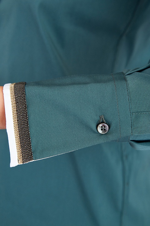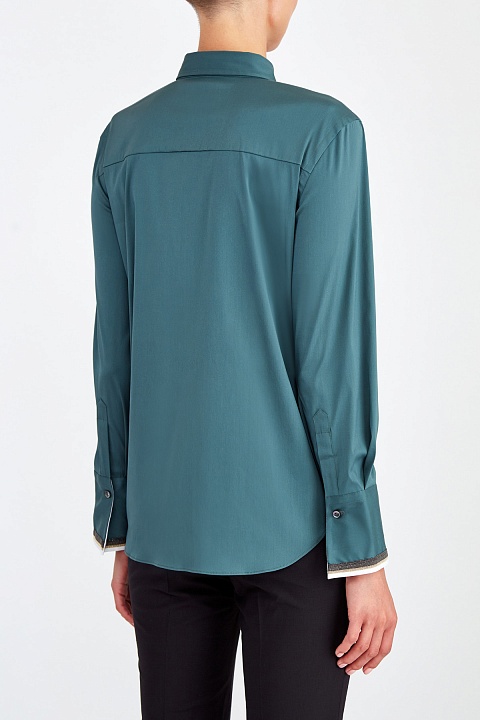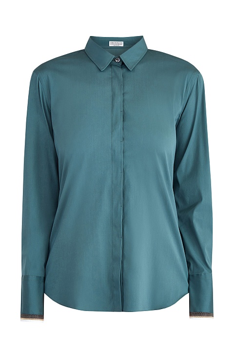 Элегантная рубашка свободного кроя от Brunello Cucinelli выполнена из хлопкового поплина в оттенке морской волны. Французский воротник делает модель изящной. Мерцающая двухцветная вышивка цепочкой Мониль завершает высокие отложные манжеты. Дополнительная планка скрывает застежку на пуговицы. Ткань наполнена перламутровым сиянием, которое придает модели нотку неформального шика. Сделано в Италии.