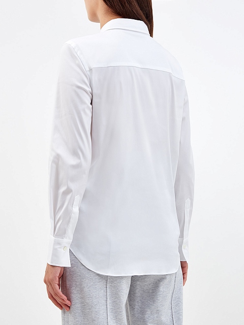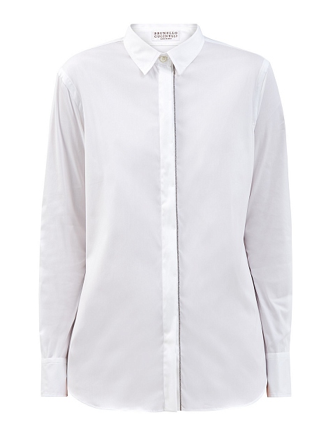 Элегантная рубашка из хлопкового поплина от Brunello Cucinelli выполнена в универсальном белом цвете, волокна эластана в составе облегчают уход за изделием. Стиль smart casual подчеркивает прямой силуэт с закругленным нижним краем, планка застежки дополнена мерцающей вышивкой ювелирными бусинами Мониль. Сделано в Италии.