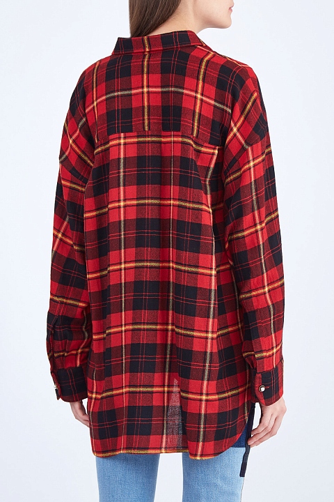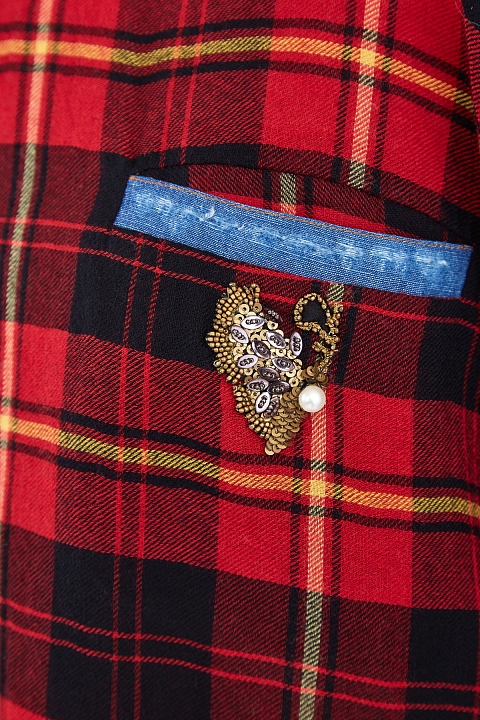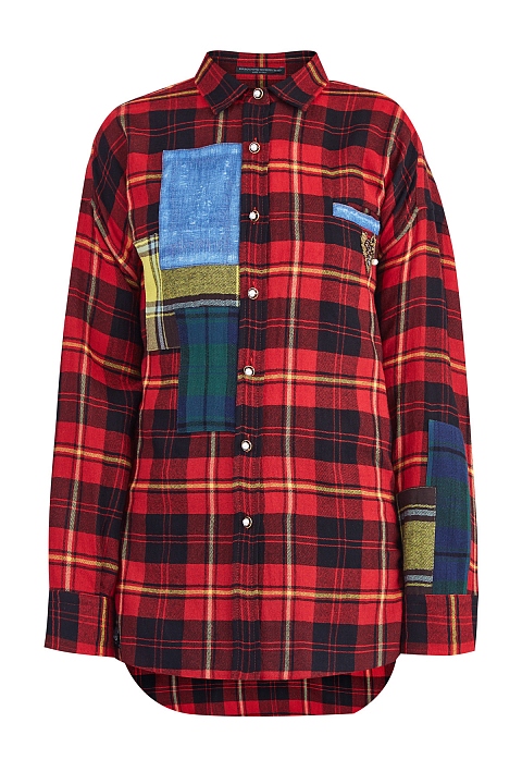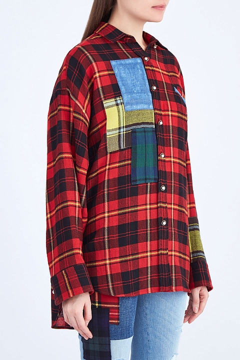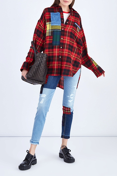 Яркая рубашка oversize-кроя от Ermanno Scervino создана из держащей форму шерстяной ткани с добавлением волокон хлопка для придания мягкости. Модель декорирована принтом в шотландскую клетку в черно-алой гамме, а также дополнена мозаичными нашивками из денима. Нагрудный карман дополнен вышивкой ручной работы из бисера. Детали: пуговицы в винтажном стиле, отложной ворот. Сделано в Италии.