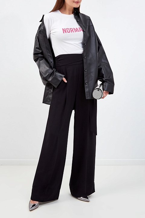 Однотонная рубашка кроя oversize от Ermanno Scervino создана из мягкой кожи ягненка с бархатистой внутренней поверхностью. Гладкий материал в глубоком черном цвете с глянцевым финишем подчеркивает неформальный стиль изделия. Спущенная линия плеч и асимметричный нижний край с декоративными разрезами придают образу расслабленный штрих. Застежка на зеркальные пуговицы круглой формы на передней планке завершает дизайн. Детали: длинные рукава, отложной воротник, простроченные швы. Сделано в Италии.