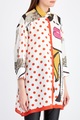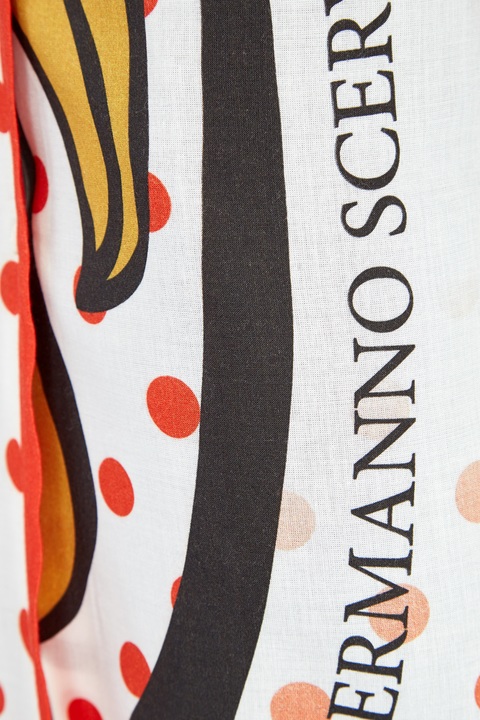 Воздушная женская рубашка oversize-кроя от Ermanno Scervino выполнена из тонкого муслина — матовой летящей ткани на основе мягкого модала с волокнами кашемира. Знаковый для коллекции принт в стиле поп-арт дополнен контрастной отделкой кромок и монограммой бренда. Детали: рукава ¾ на манжетах, удлиненный силуэт, застежка на пуговицы, отложной воротник. Сделано в Италии.