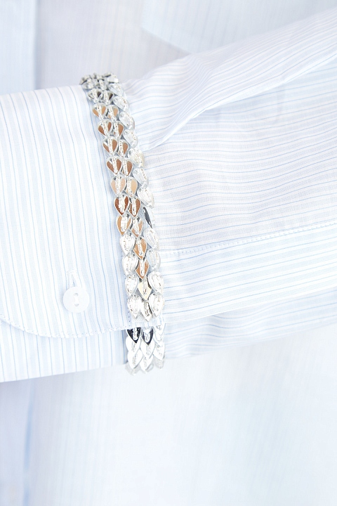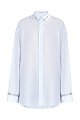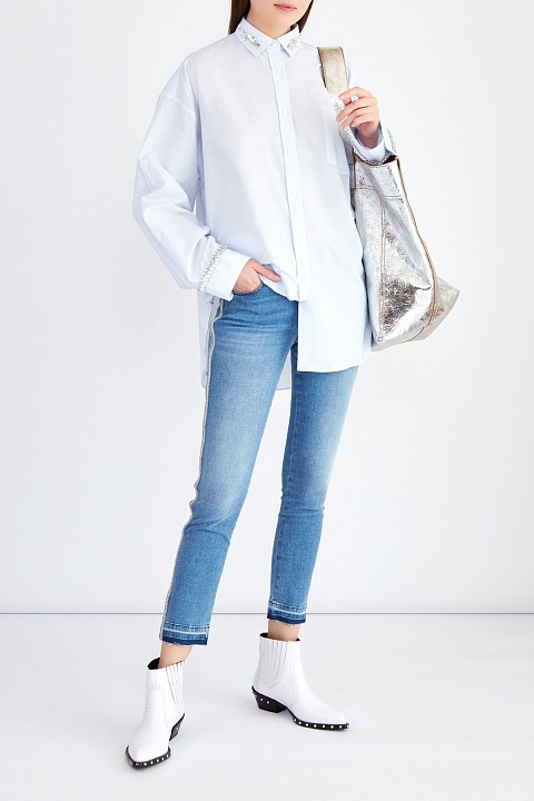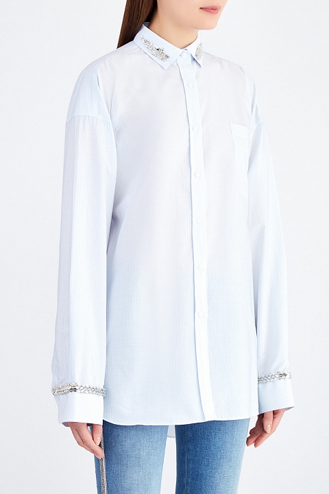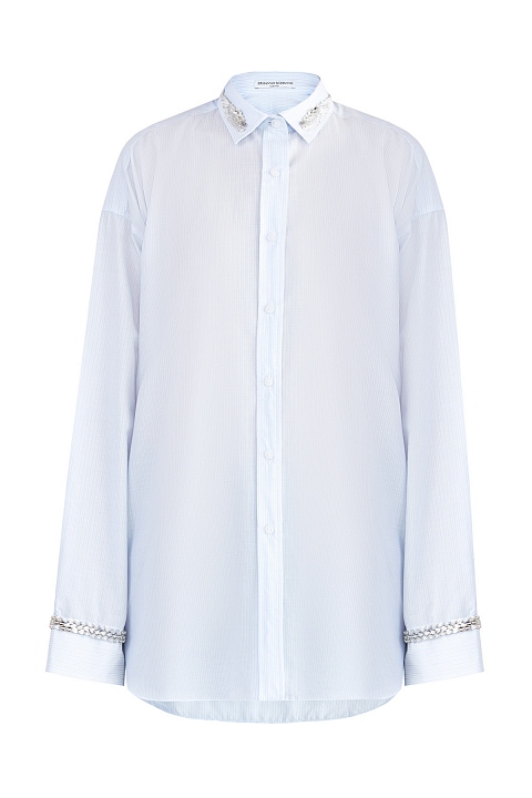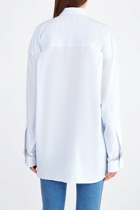 Эффектная женская рубашка расслабленного кроя от Ermanno Scervino выполнена из плотного хлопкового поплина с принтом в полоску в голубых и белых тонах. Вышивка ручной работы из пайеток, кристаллов и зеркальных пластин украшает воротник и рукава изделия. Модель с асимметричным низом и разрезами в боковых швах. Сделано в Италии.