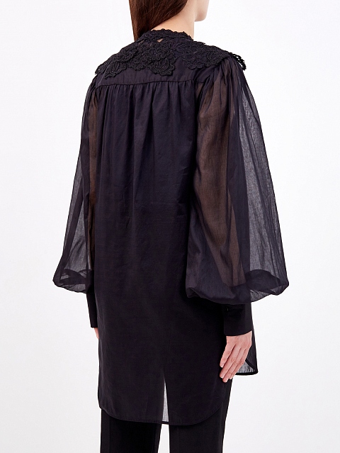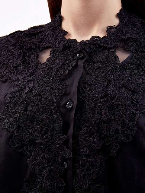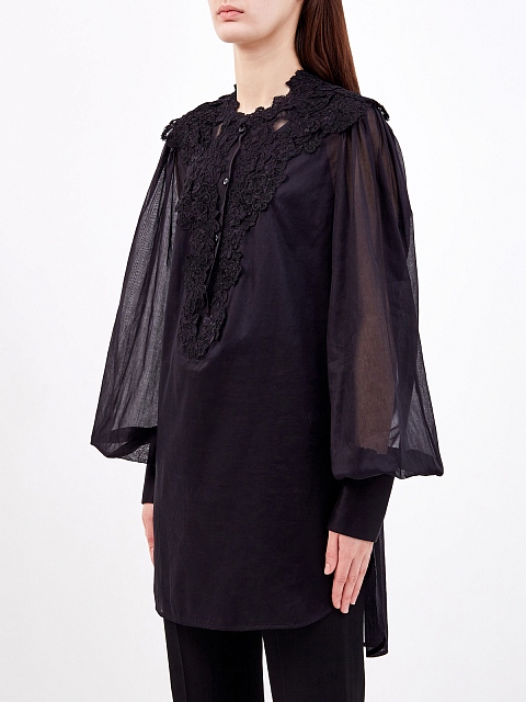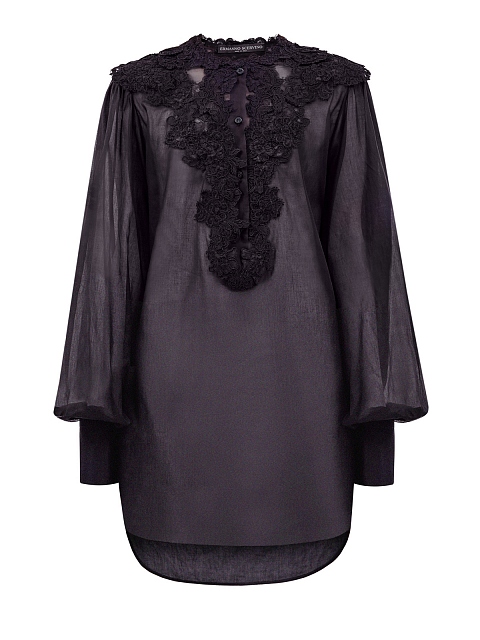 Женственная рубашка свободного кроя от Ermanno Scervino выполнена в элегантном черном цвете. Модель из легкого хлопкового муслина обеспечивает максимальный комфорт в летний сезон. Кружевная вышивка ручной работы и объемные рукава подчеркивают расслабленный стиль изделия. Детали: отложной воротник, застежка на пуговицы, закругленный нижний край. Сделано в Италии.