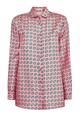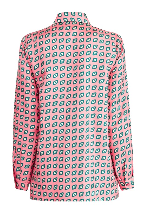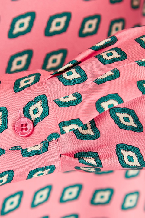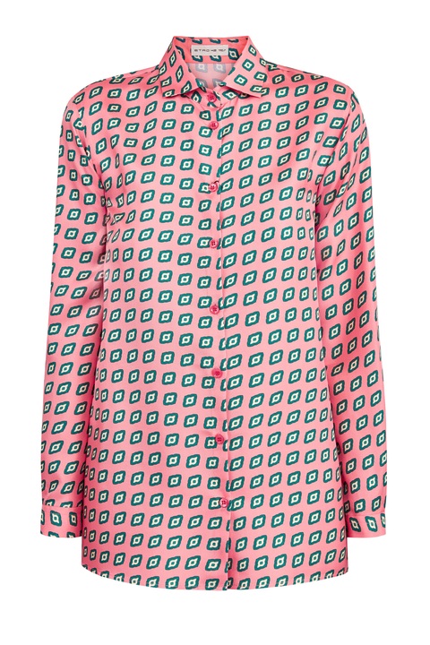 Свободная блуза от Etro выполнена из натурального шелка с атласной текстурой теплого розового оттенка. Поверхность изделия дополнена ярким этническим принтом в изумрудных и молочных тонах. Классический крой подчеркнут отложным воротом, застежкой на пуговицы и манжетами на длинных рукавах. Сделано в Италии.