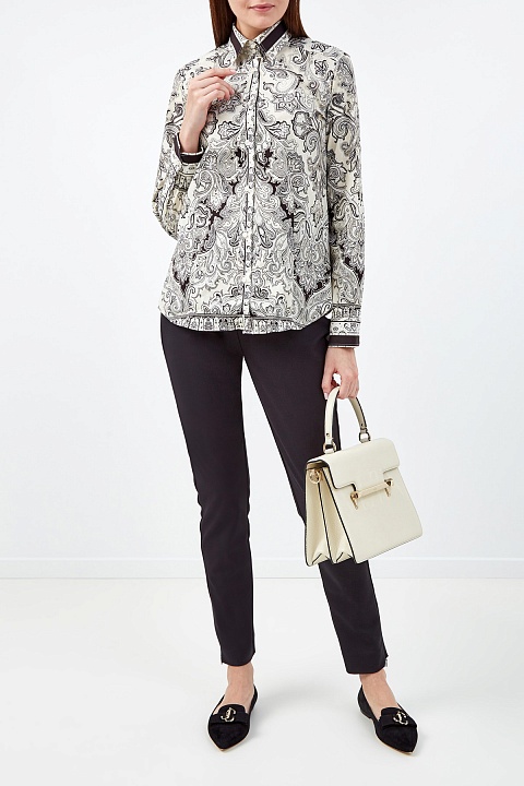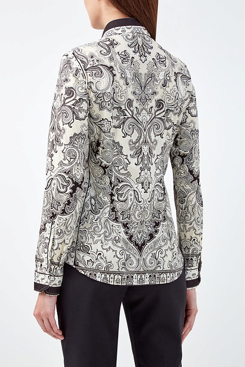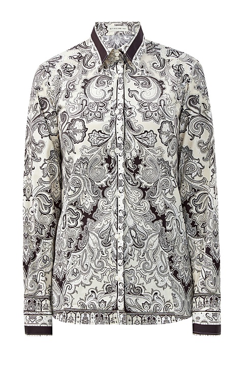Приталенная женская рубашка от Etro выполнена из плотного хлопка в оттенке слоновой кости. Выверенный состав делает ткань эластичной, сохраняя комфорт в движении. Принт в технике печати был подобран специально под каждый из элементов кроя. За счет закругленных нижних кромок изделие органично смотрится как в заправленном виде, так и навыпуск. Детали: классический отложной воротник, застежка на пуговицы из перламутра. Сделано в Италии.