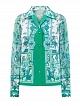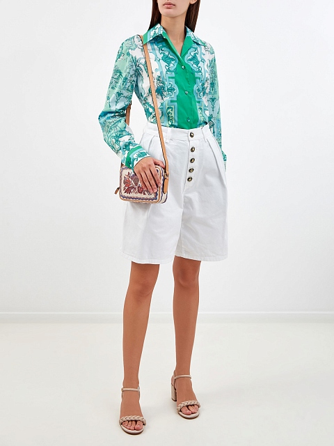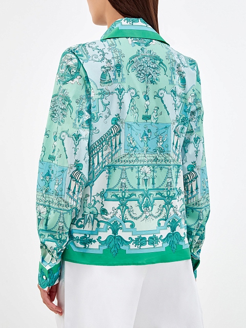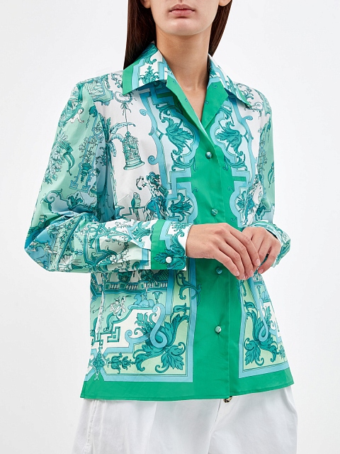 Элегантная блуза от Etro выполнена из гладкого хлопка с атласной текстурой, эластичные волокна в составе облегчают уход за изделием. Фирменный стиль подчеркивает набивной принт в бирюзовой гамме по всей поверхности. Классический крой подчеркнут отложным воротом с лацканами, застежкой на пуговицы и манжетами на длинных рукавах.