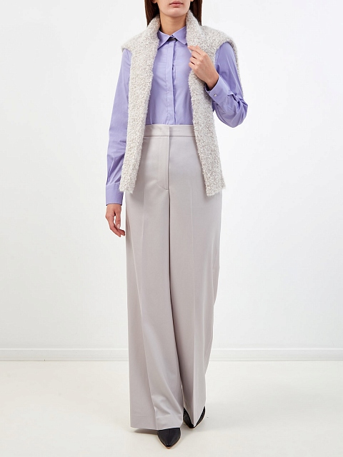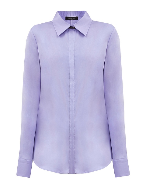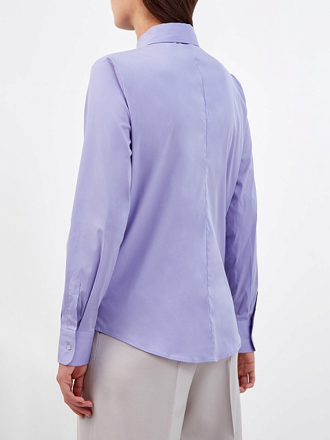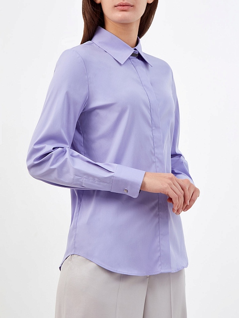 Элегантная женская рубашка от Fabiana Filippi выполнена в приглашенном лиловом оттенке. Гладкая текстура эластичного хлопкового поплина обеспечивает максимальный комфорт в движении и идеально подходит для создания классических и деловых образов. Фирменный мерцающий штрих — вставка из латунных цепочек под отложным воротом. Детали: закругленный нижний край, застежка на пуговицы из перламутра. Сделано в Италии.