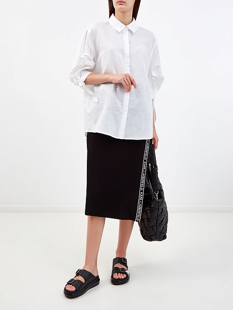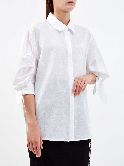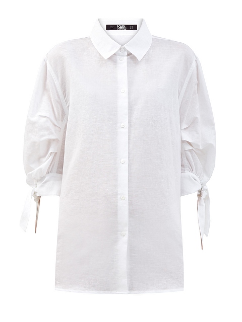 Рубашка из льняного муслина от Karl Lagerfeld. Воздушная текстура ткани подчеркивает объемные рукава с завязками на манжетах и присборенными вставками. Удлиненный крой придает образу расслабленный штрих, а отложной ворот вносит структурирующий акцент. Детали: застежка на фирменные пуговицы из перламутра, вышитая монограмма бренда.