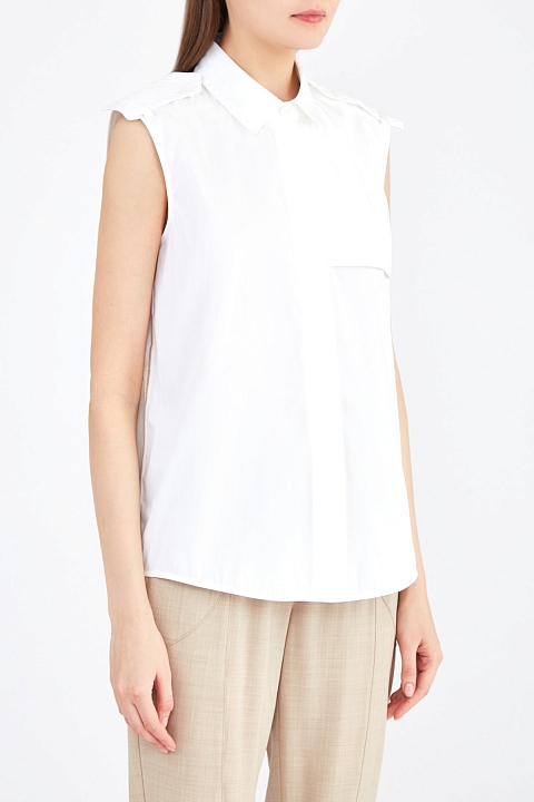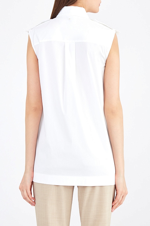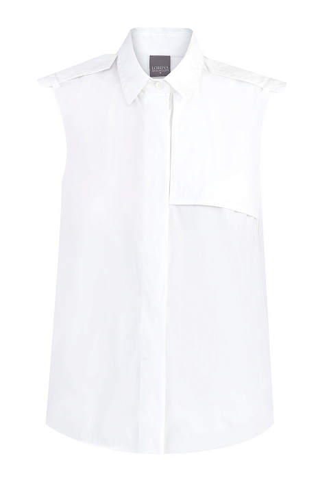 Минималистичная рубашка от Lorena Antoniazzi выполнена из плотного хлопка классического белого цвета. Модель без рукавов дополнена отложным воротом, кокеткой на передней планке и хлястиками на плечевых швах в стиле милитари. Детали: заложенные складки от кокетки на спинке, асимметричная нижняя кромка, потайная застежка на пуговицы. Сделано в Италии.