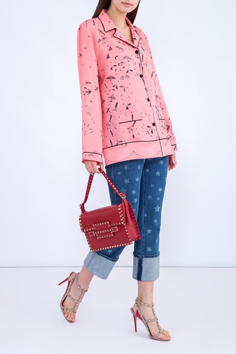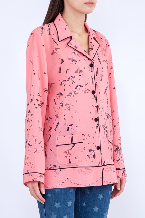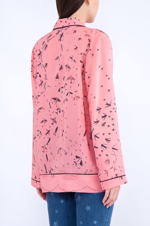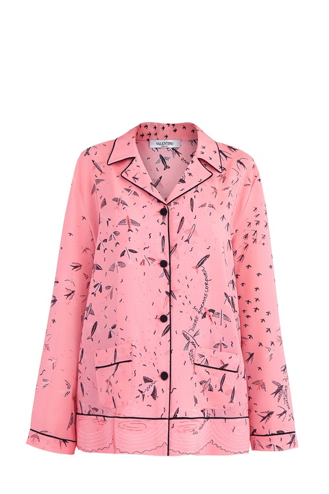 Яркая блузка Valentino свободного кроя в пижамном стиле, выполненная из нежного шелка с гладкой атласной поверхностью нежно-розового цвета, украшенной минималистичным принтом контрастного оттенка в виде птиц. Все кромки обрамлены кантом, поддерживающим гамму основного узора. Изделие с накладными кармашками по бокам, неглубоким V-образным вырезом, оформленным английским воротом и длинными рукавами. Сделано в Италии.