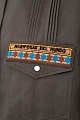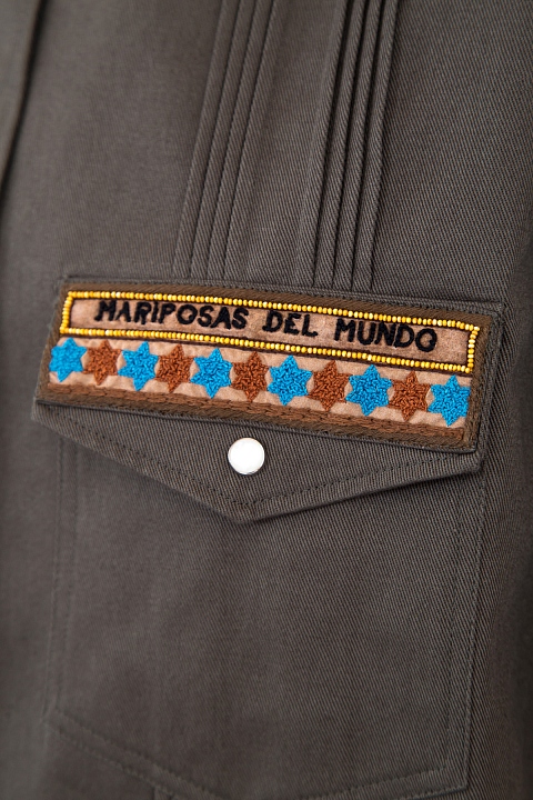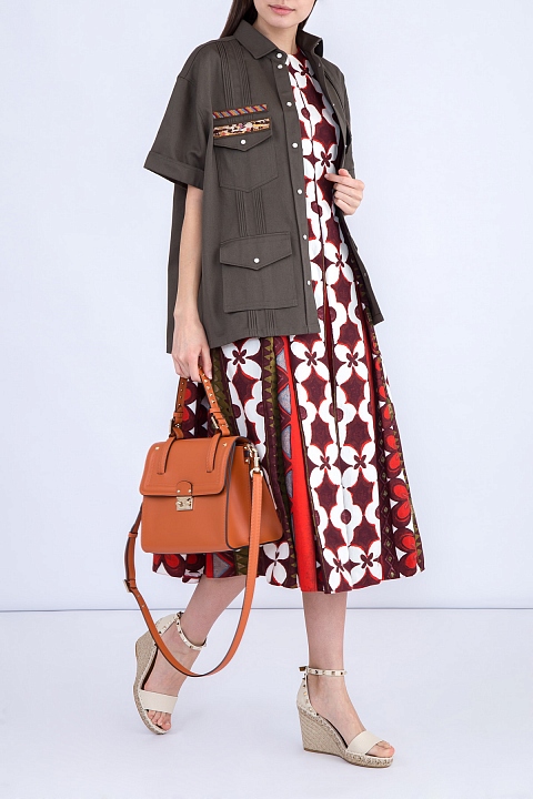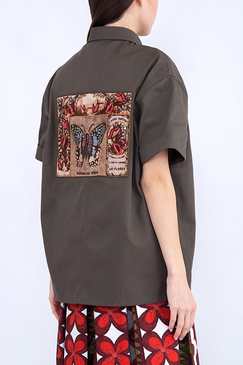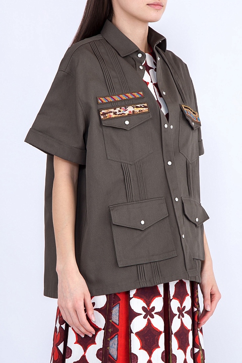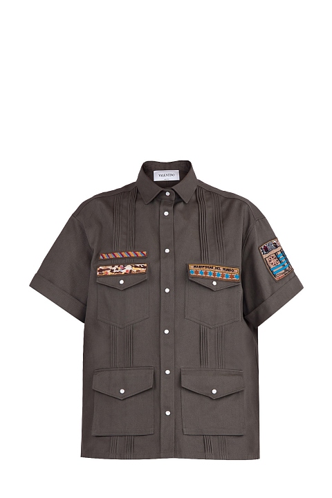 Эффектная рубашка Valentino прямого кроя в стиле милитари, выполненная из плотного хлопкового денима цвета хаки. Модель дополнена накладными карманами на передней планке и ручной вышивкой нитью, отсылающей к мотивам, украшающим коробки кубинских сигар. Изделие с отложным воротником и короткими рукавами. Застежка осуществляется на клепки в центральной планке. Сделано в Италии.