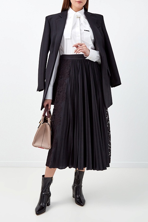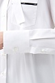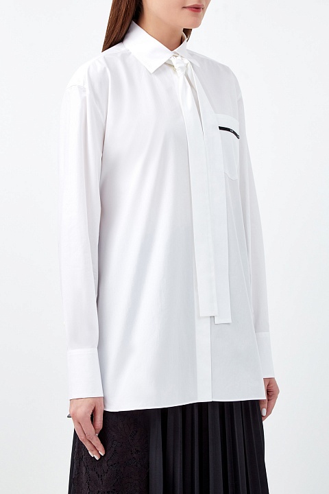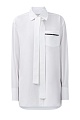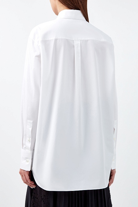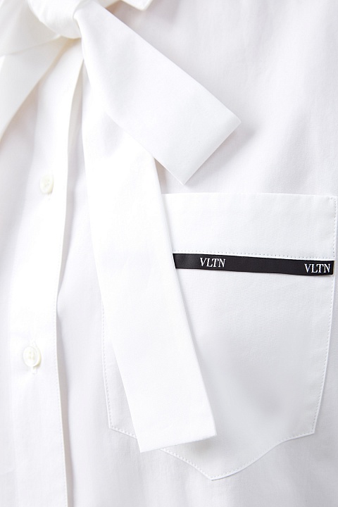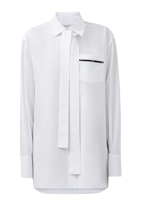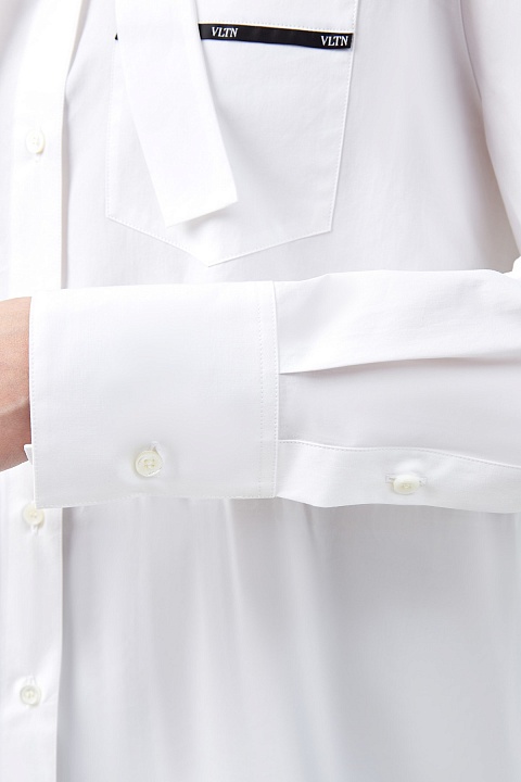Расклешенная белая рубашка от Valentino выполнена из держащего форму хлопкового поплина. Классический дизайн с отложным воротником и манжетами дополнен ярким акцентом в виде контрастной тесьмы с принтом VLTN на нагрудном кармане. Детали: съемный шарф-галстук, двойная кокетка на спинке с заложенными складками, застежка на пуговицы, асимметричные нижние кромки. Сделано в Италии.