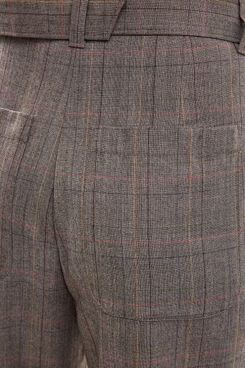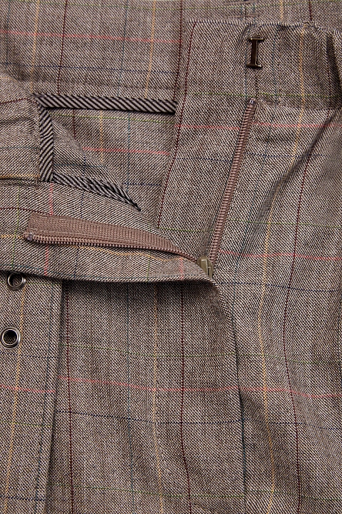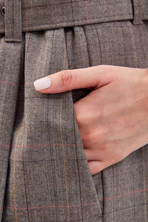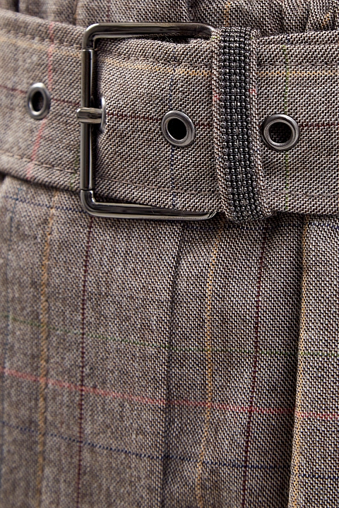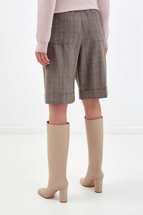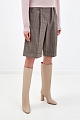Лаконичные бермуды Baggy от Brunello Cucinelli выполнены из легкой шерсти Tropical Luxury в пепельно-коричневой гамме. Полностью натуральный состав материала из ценных волокон делает модель максимально комфортной, а натуральный оттенок с узором в клетку подчеркивает слегка неоднородную фактуру. Изделие на высокой посадке с заложенными складками формирует гармоничные пропорции и не стесняет движений. Детали: застежка на молнию и крючок на передней планке, расклешенный силуэт, съемный ремень с вышивкой цепочками Мониль. Сделано в Италии.