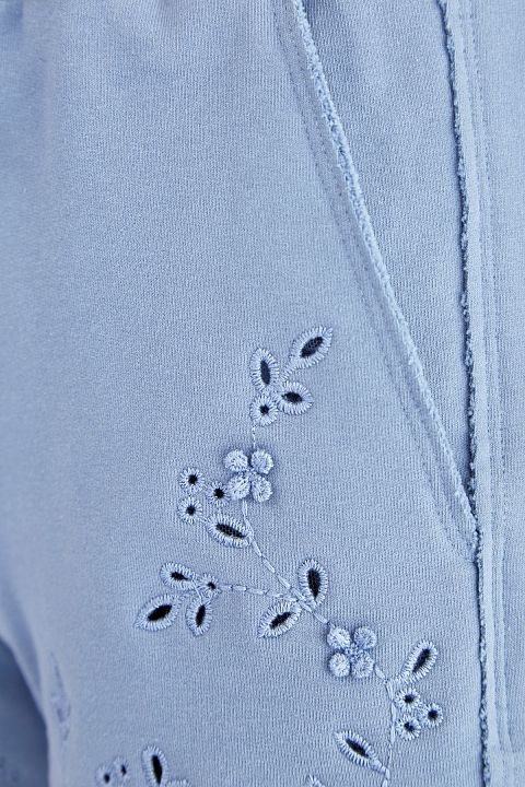 Спортивные женские шорты расклешенного кроя от Ermanno Scervino выполнены из плотного хлопкового футера с фактурной внутренней поверхностью. Присущий Модному дому стиль спортшик подчеркнут цветочным кружевным узором с перфорацией и объемными элементами ручной работы. Детали: широкий пояс на кулиске, кромки с фестончатой отделкой, прорезные карманы. Сделано в Италии.