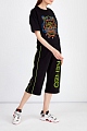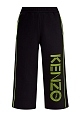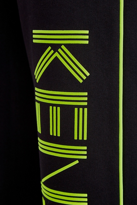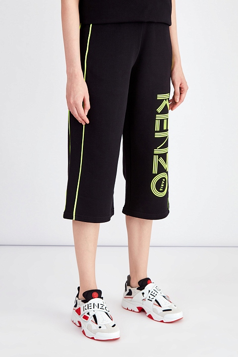 Яркие брюки-кюлоты от Kenzo выполнены в черном цвете из хлопкового футера. Традиционная для спортивного стиля ткань в сочетании с элегантным кроем создает образ в стиле спортшик. Лаконичный фон подчеркивает неоново-зеленые лампасы и объемную макро-монограмму в технике аппликации. Детали: эластичный притачной пояс, прорезные карманы с молниями по бокам.