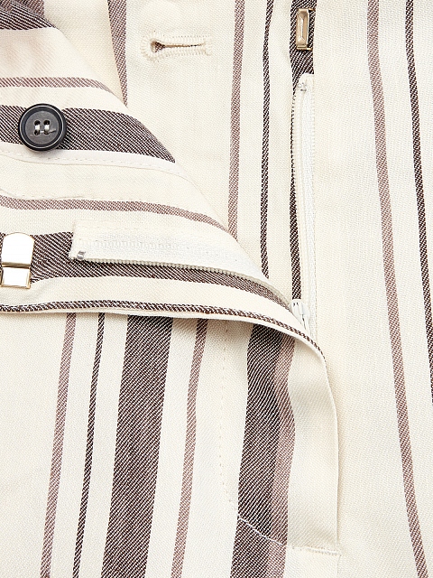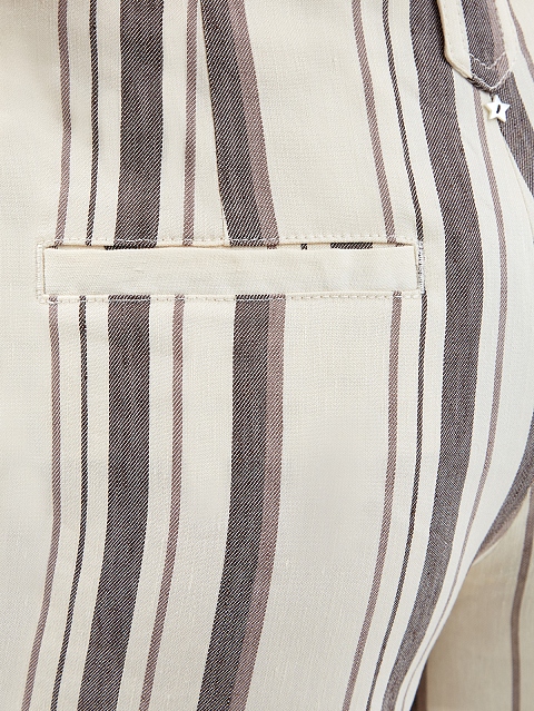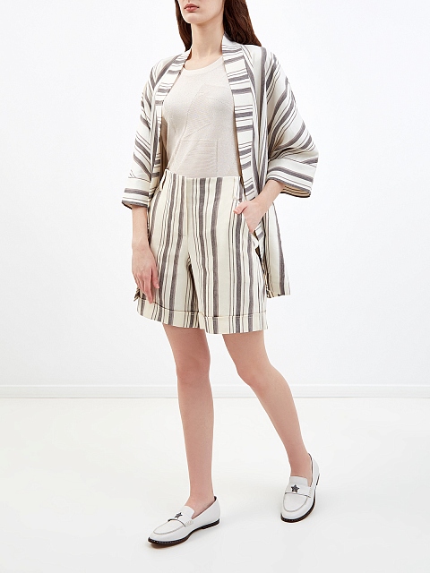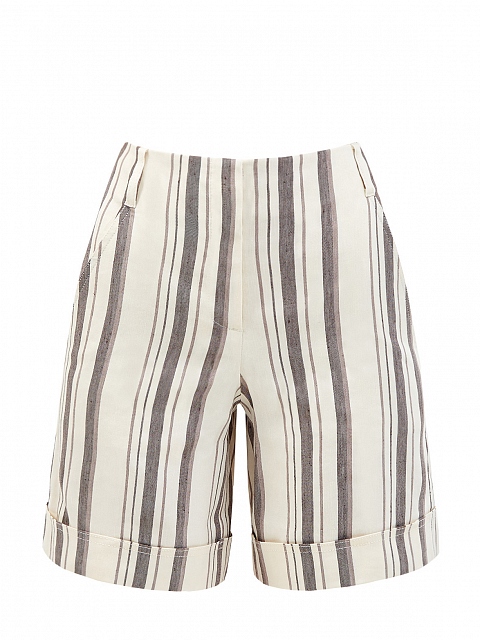 Лаконичные шорты слегка расклешенного кроя от Lorena Antoniazzi выполнены из фактурного льна с добавлением древесных волокон вискозы, натуральная бежево-коричневая гамма подчеркивает текстуру ткани. Изделие в строгом стиле на высокой посадке дополнено принтом в вертикальную полоску. Детали: застежка на молнию и пуговицу, прорезные карманы. Сделано в Италии.