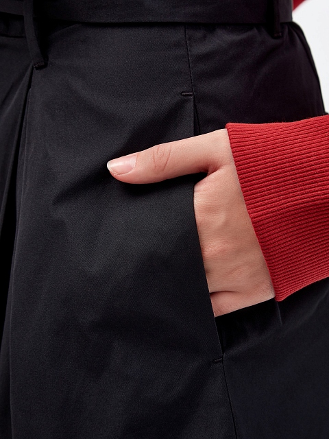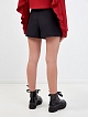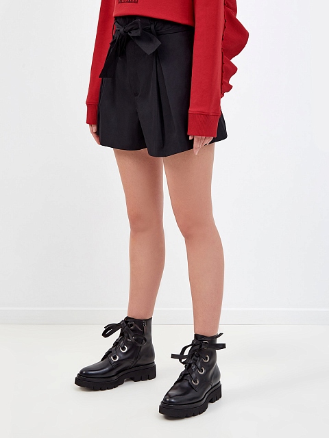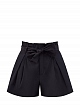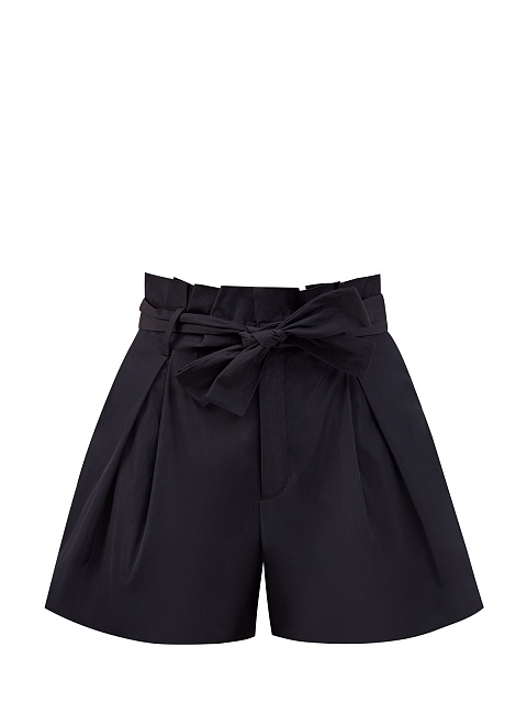 Элегантные женские шорты в универсальном черном цвете от REDValentino выполнены из гладкой ткани кади — износостойкий материал хорошо держит свою форму. Высокая линия талии оформлена тонким поясом, образующим объемный бант. Заложенные складки и диагональные прорезные карманы визуально моделируют силуэт. Потайная застежка на молнию и крючки на передней планке завершает минималистичный дизайн.