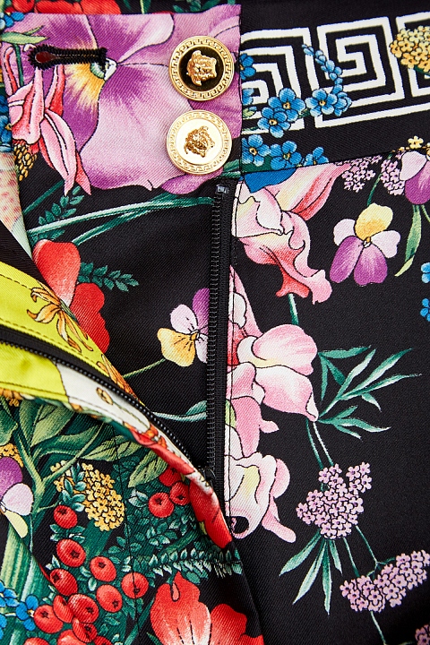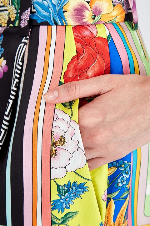 Эффектные шорты от Versace выполнены из шелкового твила — натуральной струящейся ткани с атласной текстурой. Модель украшена фирменным принтом Bloom, а также культовым мотивом Greca — вместе они символизируют весну в прочтении Модного дома. Детали: диагональные прорезные карманы, притачной пояс с застежкой на фирменные пуговицы и молнию. Сделано в Италии.