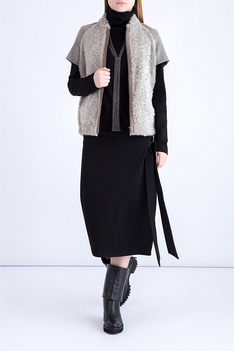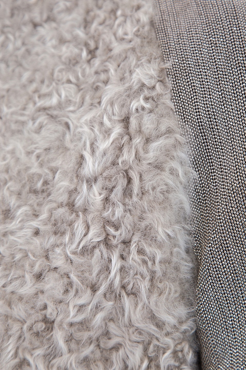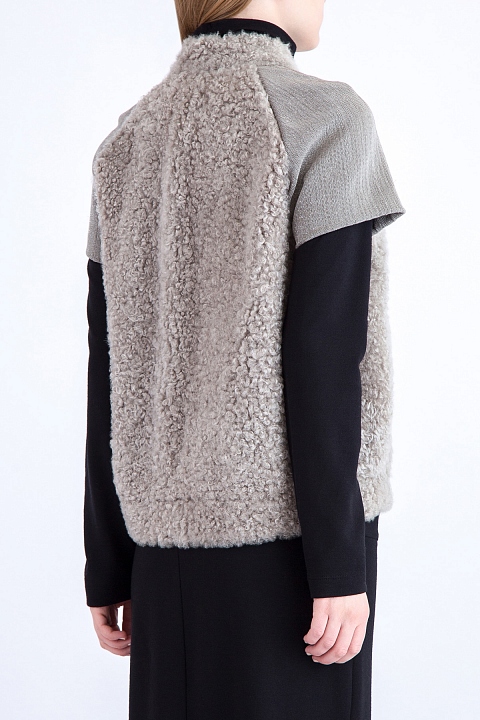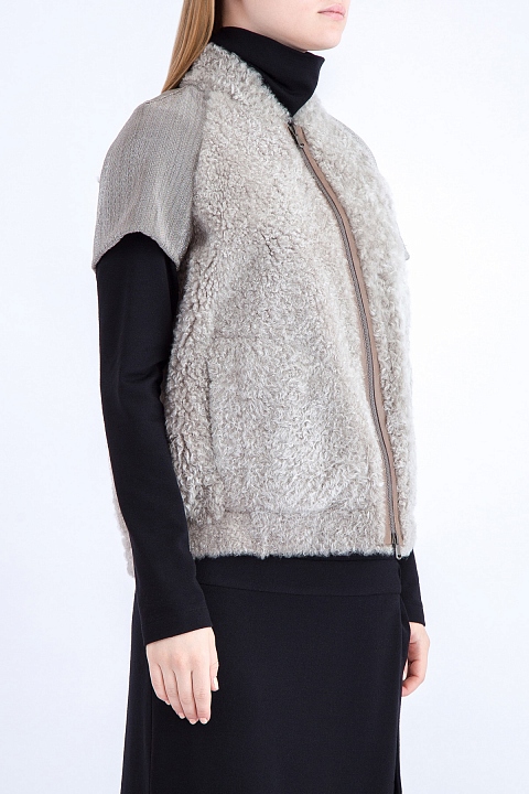 Меховой жилет Brunello Cucinelli прямого кроя изготовлен из натуральной овчины серо-коричневого оттенка. Особенностью изделия являются короткие рукава-реглан, декорированные тонкими нитями из бусин мерцающей монили с серебристым гальваническим покрытием. С изнаночной стороны рукава дополнены шелковой подкладкой, гармонично завершая образ. Модель с фирменной брендовой нашивкой внутри, без подкладки. Произведено в Италии.