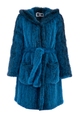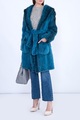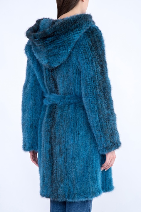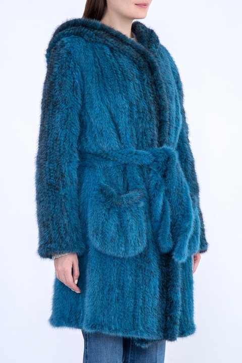Шуба из меха норки бирюзового оттенка с капюшоном и поясом