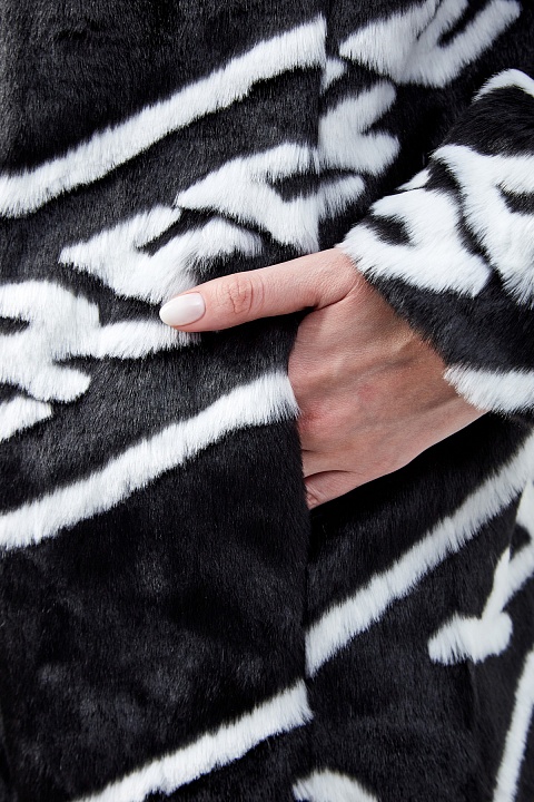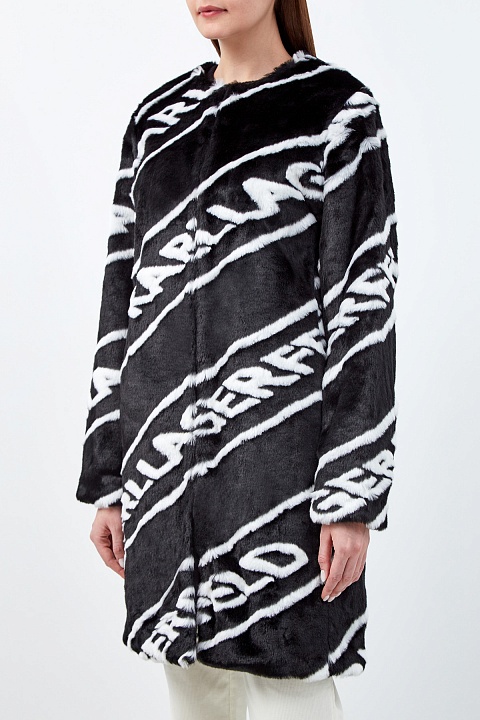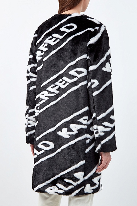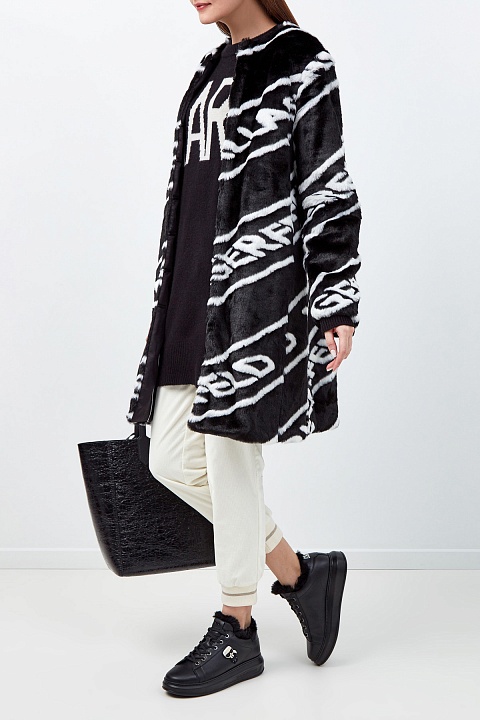 Элегантная шуба кроя трапеция от Karl Lagerfeld выполнена из экологически чистого меха. Черно-белый принт с монограммой в духе логомании сочетается с бонтон-силуэтом без воротника и создает образ в стиле спортшик. Детали: потайная застежка на крючки, два кармана, подкладка из атласной вискозы. Длина по спинке 90 см.
