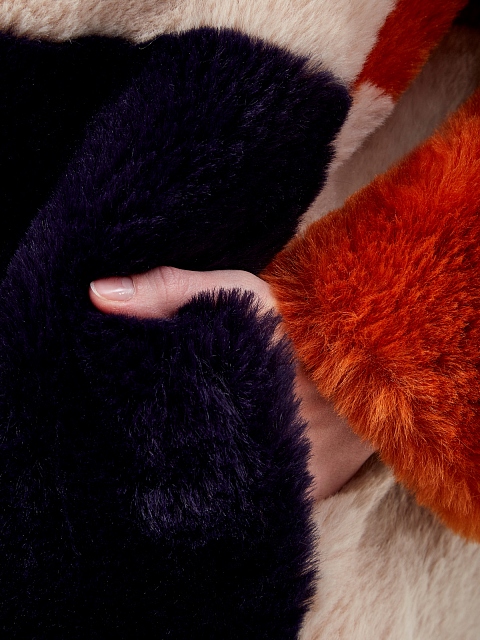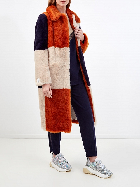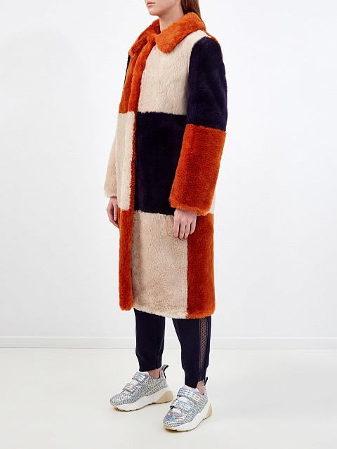 Яркая шуба от Stella McCartney выполнена из экологически чистого меха KOBA® Fur Free Fur, который по текстуре приближен к меху кролика. Переработанный материал пригоден для вторичной переработки и полностью состоит из растительных волокон. Изделие с colorblock-принтом в стиле петчворк. Детали: полностью на подкладке из хлопка и вискозы, отложной воротник, прорезные карманы.