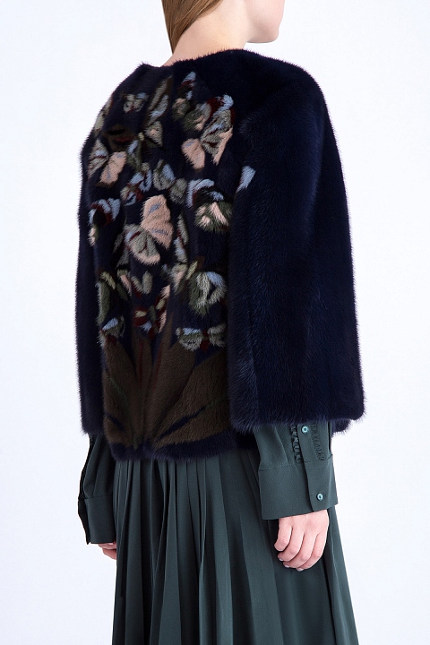 Эффектная укороченная шуба Valentino свободного кроя. Модель выполнена из меха норки глубокого темно-синего оттенка с мягкой и шелковистой поверхностью. Изделие с круглым вырезом горловины, без ворота и широкими рукавами длиной 7/8. Спинка декорирована узором в виде листьев и бабочек, изготовленных в технике пэчворк из множества лоскутов, искусно подобранных по цветам. Застежка осуществляется при помощи крючков. Сделано в Италии.