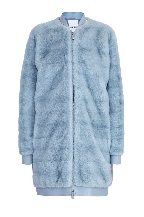 Стильная женская шуба-бомбер Valentino удлиненного кроя. Модель выполнена из меха норки с коротким и густым ворсом голубого цвета и дополнена вставками на вороте, манжетах и нижней кромке из кожи ягненка в тон. Образ завершает застежка-молния в центральной планке и фирменные клепки-пирамидки на рукавах. Сделано в Италии.