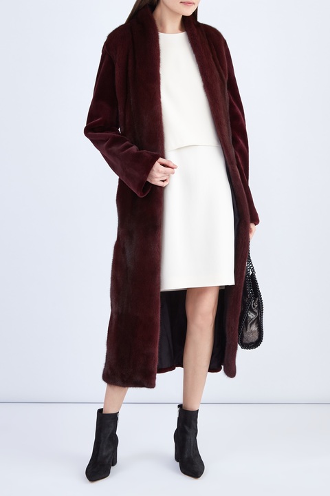 Элегантная шуба-миди от Yves Salomon выполнена из меха стриженной финской норки с густым подшерстком и богатой текстурой в богатом винном оттенке. Передняя планка и шалевый ворот модели дополнены вставками из блестящего меха в тон. Элегантный приталенный силуэт формирует съемный меховой пояс. Изделие полностью на подкладке из шелка. Детали: прорезные карманы, спущенная линия плеча. Сделано во Франции.