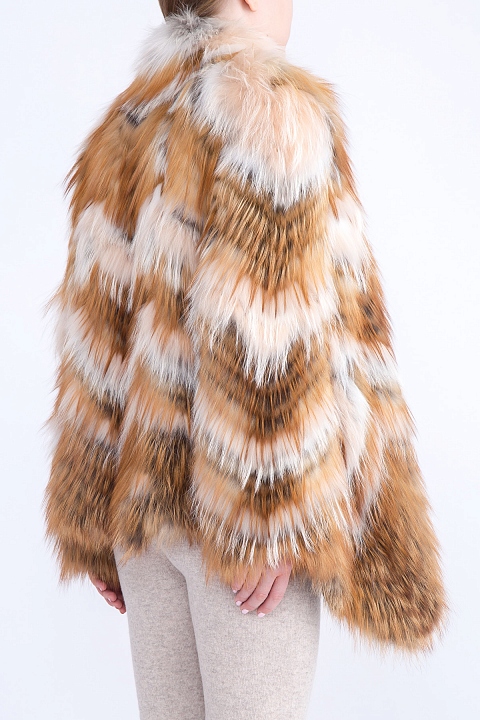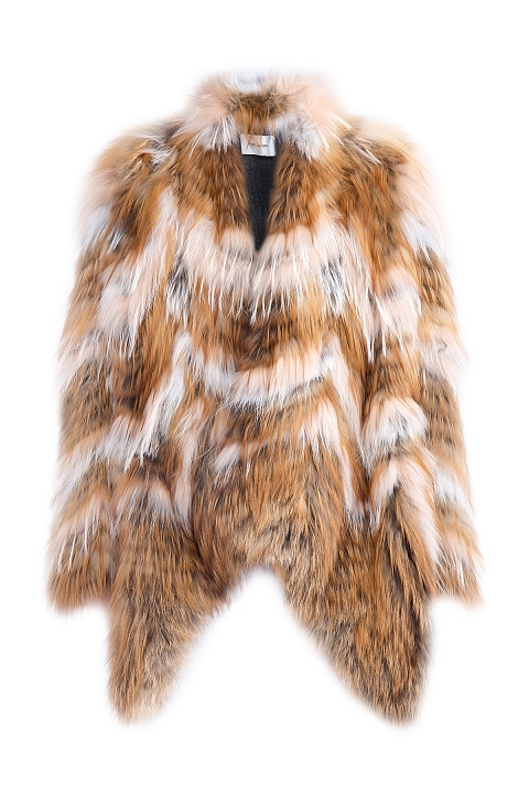 Укороченная женская шубка-накидка Yves Salomon асимметричного кроя с шалевым воротом и длинными рукавами. Модель характеризуется сочетанием меха енота и лисы двух натуральных цветов, образующих объемные абстрактные узоры на поверхности. Изделие завершает комфортная трикотажная внутренняя подкладка из вискозы. Сделано во Франции.
