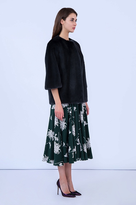 Укороченная женская шуба Yves Salomon свободного кроя выполнена из меха норки глубокого темно-зеленого оттенка. Модель характеризуется втачными рукавами длиной 3/4 , круглым вырезом горловины и потайной застежкой на передней планке. Внутри подкладка из мягкого шелка, по бокам прорезные карманы. Произведено во Франции.