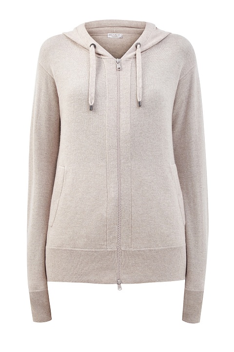 Теплая толстовка от Brunello Cucinelli. Модель полностью выполнена из кашемировой пряжи. Техника чулочной вязки с плотным расположением петель придает ткани струящуюся фактуру, а свойства натуральных волокон обеспечивают тепло и комфорт. Застежка-молния и спущенная линия плеч подчеркивают расслабленный стиль изделия. Детали: эластичная окантовка манжет и нижнего края, глубокий капюшон на кулиске, два кармана. Сделано в Италии.