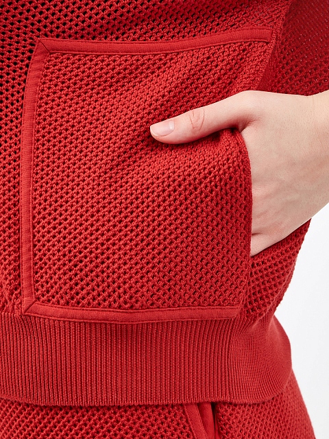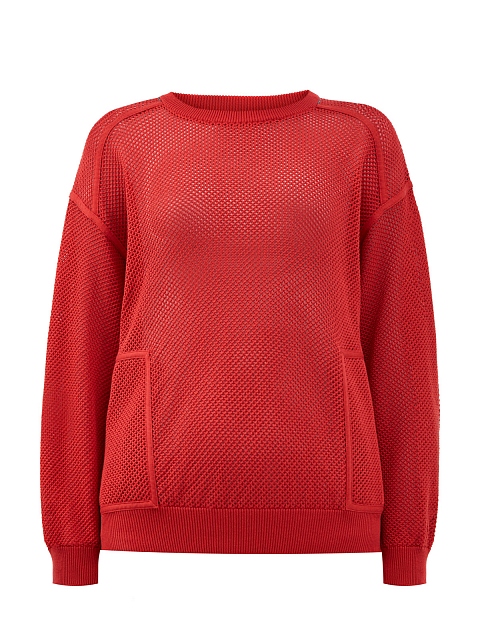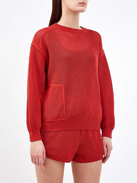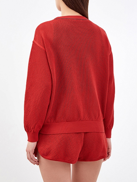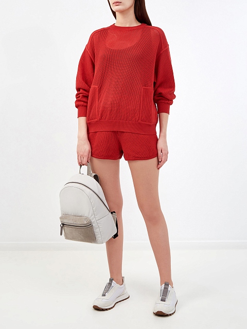 Эффектный женский пуловер в спортивном стиле от Brunello Cucinelli. Модель из легкой хлопковой пряжи в актуальном алом оттенке идеально подходит для летнего сезона. Эластичные кромки в тонкий рубчик и накладные карманы завершают дизайн. Детали: спущенная линия плеч, вышивка цепочками Мониль на спинке. Сделано в Италии.