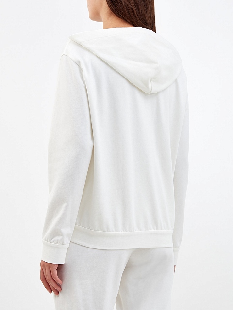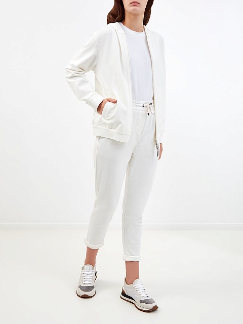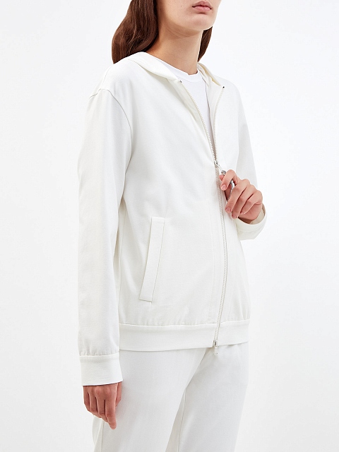 Стильная женская толстовка Active из коллекции Travelwear от Brunello Cucinelli полностью выполнена из мягкого футера, собранные вручную волокна хлопка позволяют получить гладкую и легкую ткань. Изделие в базовом белом цвете дополнено пуллером с мерцающим декором из бусин Мониль. Детали: длинные рукава, глубокий капюшон, застежка на молнию, прорезные карманы. Сделано в Италии.