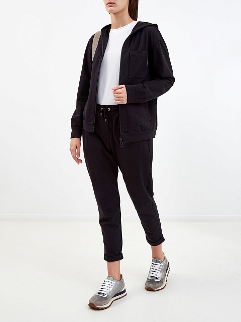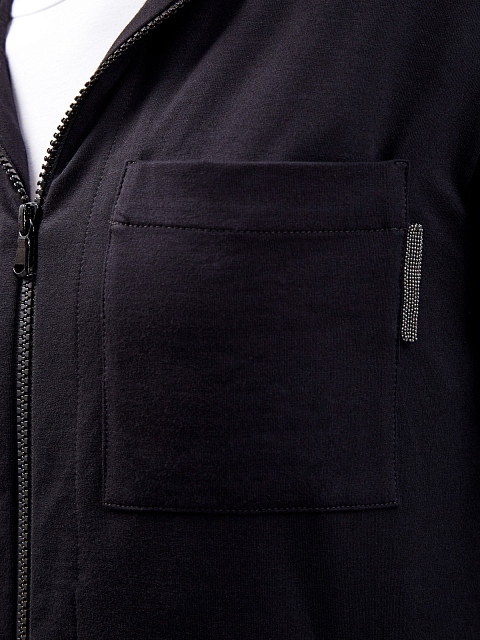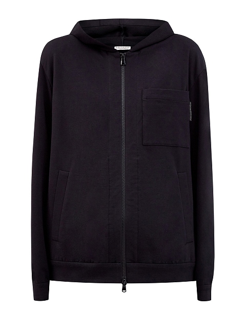 Стильная женская толстовка из коллекции Travelwear от Brunello Cucinelli выполнена из эластичного футера, собранные вручную волокна хлопка позволяют получить гладкую и мягкую ткань. Изделие в базовом черном цвете дополнено мерцающим декором из бусин Мониль на переднем кармане. Детали: длинные рукава, глубокий капюшон, застежка на молнию. Сделано в Италии.
