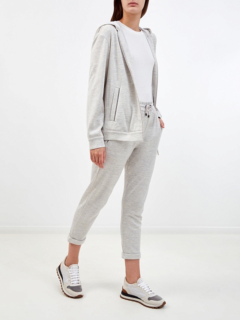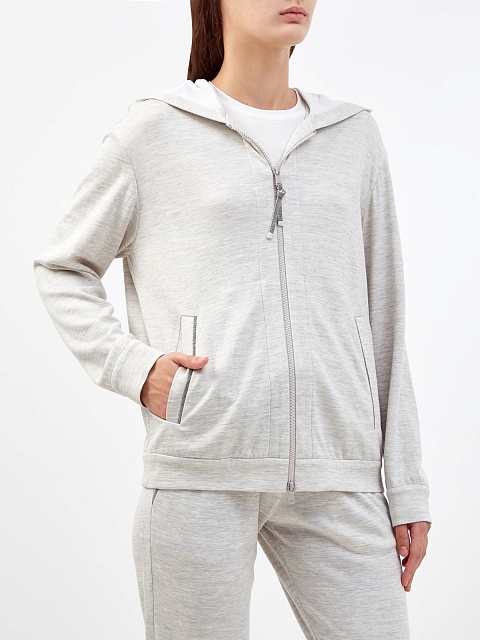 Стильная женская толстовка из коллекции Travelwear от Brunello Cucinelli создана из мягкого хлопкового футера. Шелковая нить в составе придает материалу гладкость и деликатный блеск. Изделие в меланжево-сером оттенке дополнено мерцающей вышивкой из бусин Мониль на пуллере и карманах. Детали: длинные рукава, глубокий капюшон, застежка на молнию. Сделано в Италии.