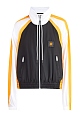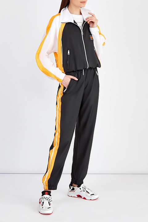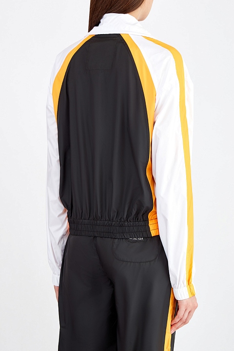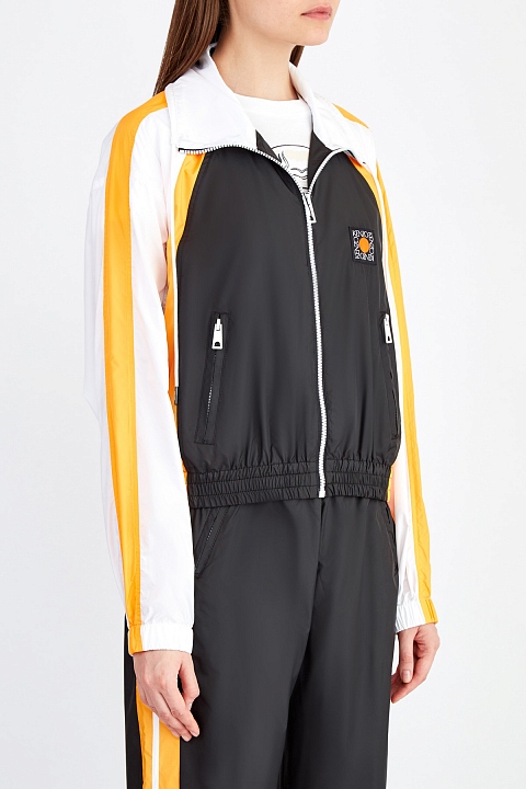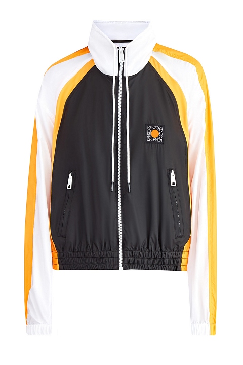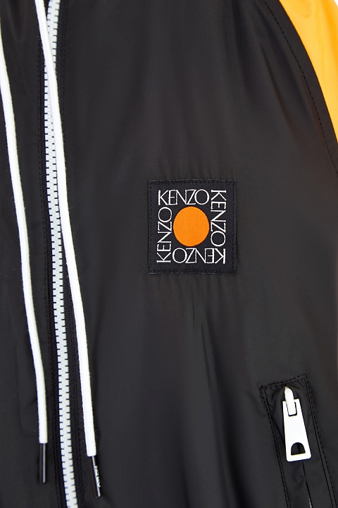 Яркая ветровка в стиле 90-х от Kenzo выполнена в горчичных, черных и белых тонах из водонепроницаемого нейлона в технике colorblock. Модель в спортивном стиле дополнена лампасами на рукавах-реглан, в также воротом-стойкой на кулиске и прорезными карманами на молниях. Эластичная окантовка кромок формирует объемный силуэт. Фирменный логотип Square Logo завершает дизайн.