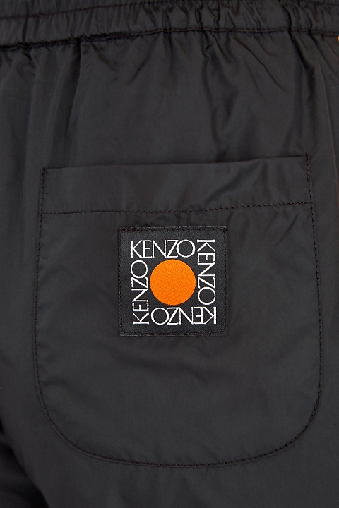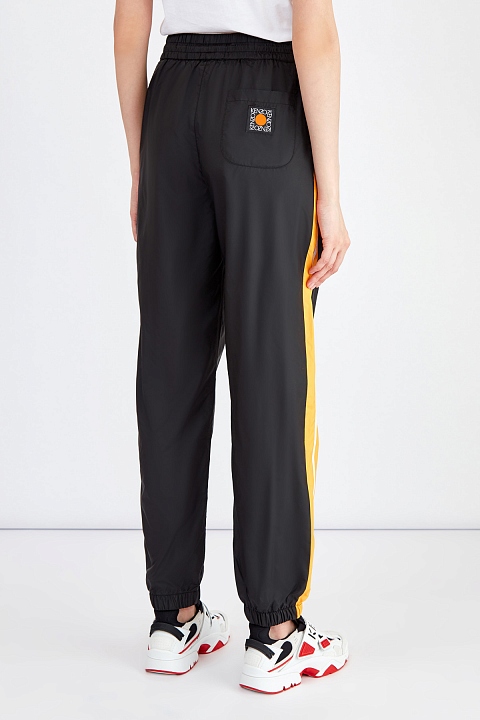 Брюки-джоггеры от Kenzo выполнены из непродуваемой и водоотталкивающей матовой ткани. Лаконичный черный цвет подчеркивает контрастные лампасы в горчичных и белых тонах. Посадку по фигуре обеспечивает эластичный пояс на кулиске. Детали: накладной карман на спинке с логотипом Square Logo, прорезные карманы с молниями на передних планках.