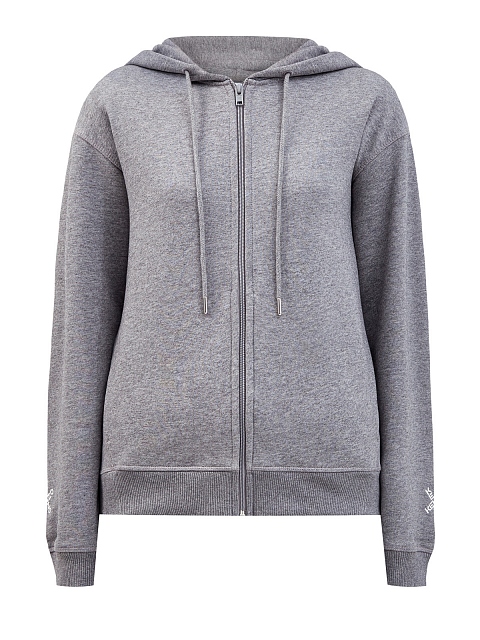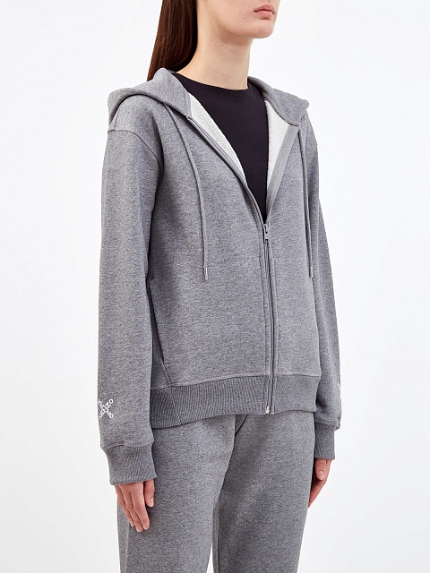 Женская толстовка из коллекции KENZO Sport от Kenzo выполнена в меланжево-сером оттенке. Натуральный материал обеспечивает комфорт в движении, эластичные волокна в составе облегчают уход за изделием. Спущенная линия плеч и трикотажные кромки формируют силуэт в спортивном стиле. Детали: макро-монограмма и логотип на рукавах и спинке, прорезные карманы, застежка на молнию, капюшон на регулируемой кулиске.