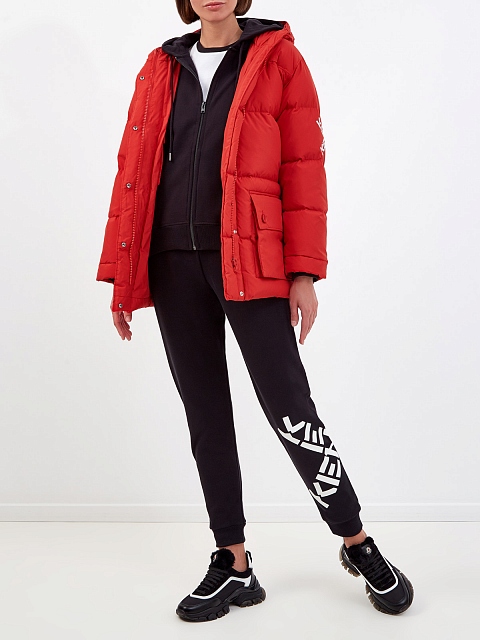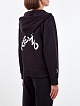Минималистичная толстовка от Kenzo выполнена в базовом черном цвете из плотного хлопкового футера. Натуральный материал обеспечивает комфорт в движении, синтетические волокна в составе облегчают уход за изделием. Спущенная линия плеч и эластичная отделка кромок формируют силуэт в спортивном стиле. Детали: макро-монограмма и логотип на рукавах и спинке, прорезные карманы, застежка на молнию, капюшон на регулируемой кулиске.