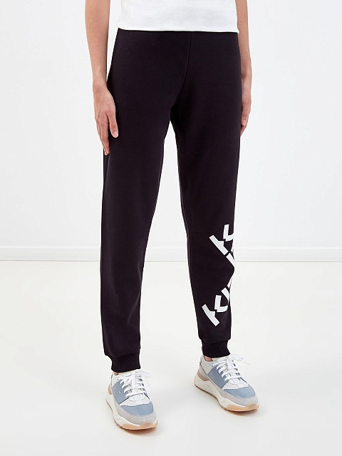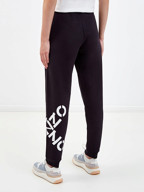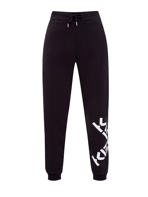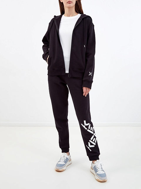Спортивные женские брюки-джоггеры в универсальном черном цвете от Kenzo выполнены из мягкого хлопка. Гладкий материал с фактурной внутренней отделкой обеспечивает максимальный комфорт и идеально подходит для создания расслабленных образов. Динамичный штрих изделию придает контрастный принт с монограммой бренда. Детали: пояс на регулируемой кулиске, эластичная отделка кромок в рубчик.